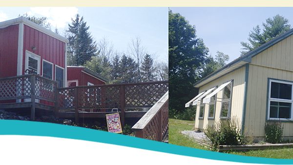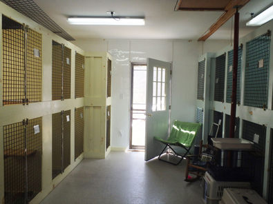 The larger dogs are boarded in individual runs, separated by solid walls on the inside for eating and sleeping comfortably. The outside "patios" are separated by a half wall and chain-link fencing. The outdoor area is covered and screened to keep the bugs out. The cats are boarded in a separate building. They stay in floor to ceiling "condos" with two floors.