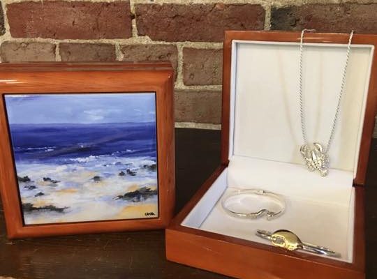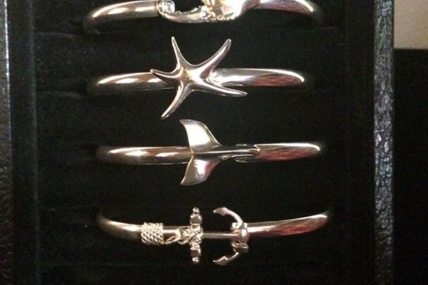 We are a complete Sterling silver store. Chains, collars, charms (unbelievable selection-lots of Maine charms) Heavy Men’s chains, pendants and bracelets. Anklets, toe rings, large selection of sterling Silver rings for men and women. Earrings in all motifs (dragonflies, dolphins, lobsters, moose and so much more).