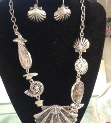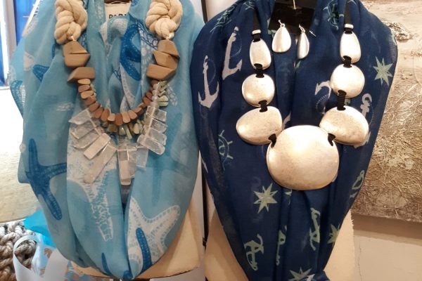We carry ocean themed home decor items, an array of seashells and sea glass as well as jewelry, Pashmina scarves and tote bags.
